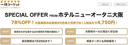 3/15~3/22正午大阪城側兩人房,原價21945円特別價格4750円(2人一室一人價位),可使用日期至7/20