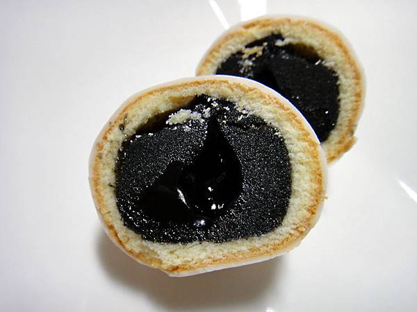 打開包裝後,立刻就有夾雜著芝麻香的蛋糕香氣冒出,有點熟悉的感覺,但一時間又想不起來,剖了斷面後...這個內餡與薄皮的比例,感覺答案快出現了