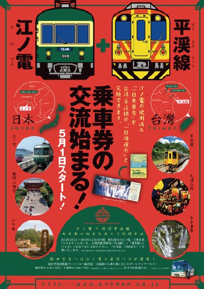 日本では、使用済みの「平渓線一日周遊券」を、江ノ電藤沢駅・江ノ島駅・鎌倉駅の乗車券窓口に持参すると、「江ノ電一日乗車券”のりおりくん”」を無償で提供いたします。