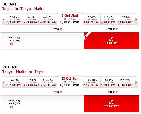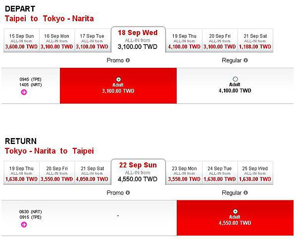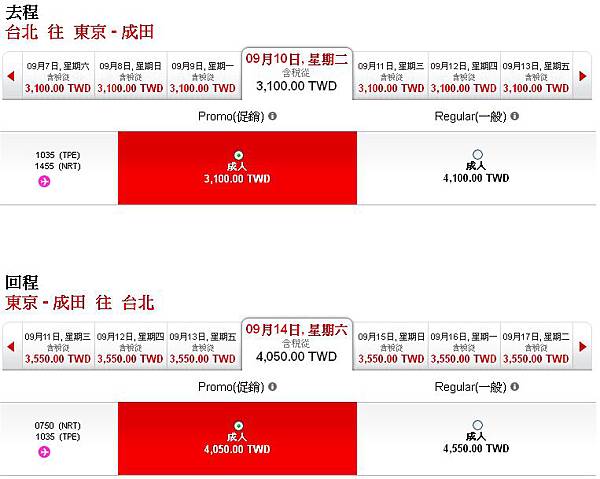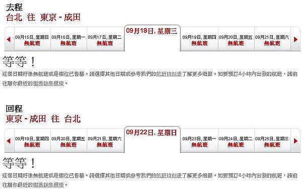 等我18:30再次上線,幾乎都沒有特價了,有沒有這麼誇張,就讓我來看看特價有幾張,選了中秋節前要補班的那一週比較少人會出國的日期9/10~9/14