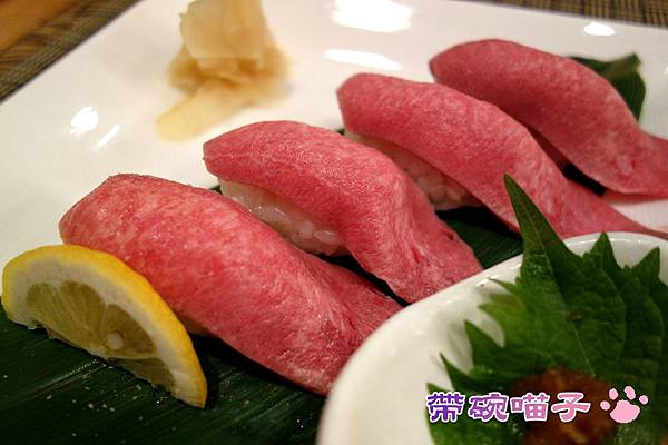 生牛舌偽裝成沒有生魚的魚味的鮪魚肚壽司。旁邊的醬好像是味增(忘記惹)