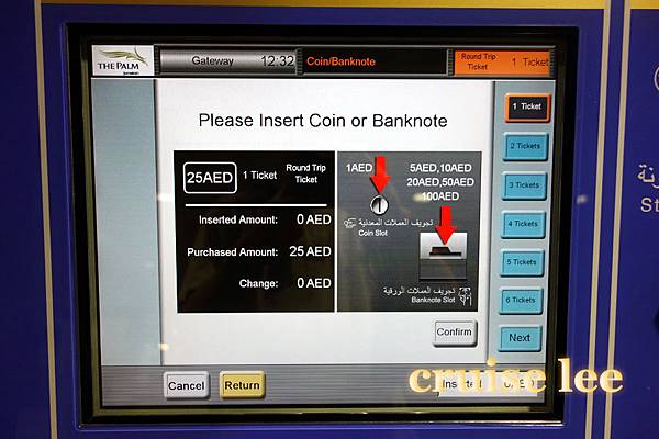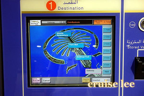 單點票15AED,不知道去那一個點到此一遊比較好,發現tour票25AED,應該是任何點皆可上下車吧,買了!付錢時想把100元鈔票找開,結果機器說找零限20元以下不收100,剩下的就只有20元鈔,投入2張,結果機器找了我15枚1元銅板,重死我