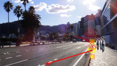剛提到騎腳踏車很危險,但其實走路也不一定安全,就算好好地走在人行道也是...銀座通那一堆クラブ(可以享受不少服務的吧...),一定有很多喝得醉醺醺還硬要開車的人,因為熱海就小小的 一下就到了。我們逛完去便利店買酒後沿路走回來,我走在前面突然聽到很近很大聲的兩聲"蹦!蹦!",然後就看到一輛車踩滿油極速逃走中,看它的軌跡跟剛剛的聲響,越想越不對就轉頭問朋友"我剛是不是差點被撞死?"之後整理出大概情形,應該是醉死的司機睡著了(虛線為假想路徑),直接在朋友旁開上人行道(親眼目睹)嚇醒瞬間再開下人行道加速逃逸,如果他沒醒來應該是從我右後方筆直衝向我,直接把我撞死在某飯店牆壁上,我一點反應的機會都沒有,因為我實際發現它是它已經衝回馬路逃走的時候了,真的是撿回一條命啊!